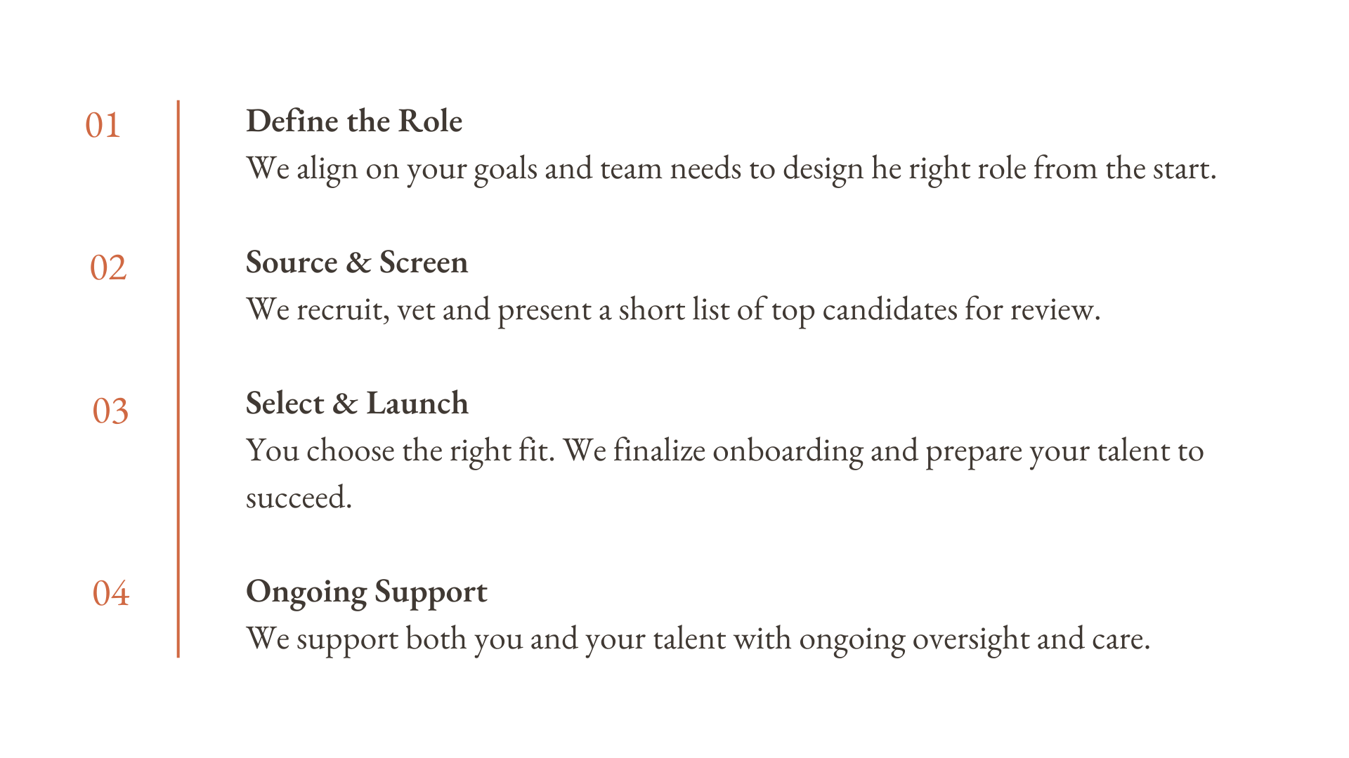 Fully managed, subscription-based talent designed to integrate seamlessly with your business.